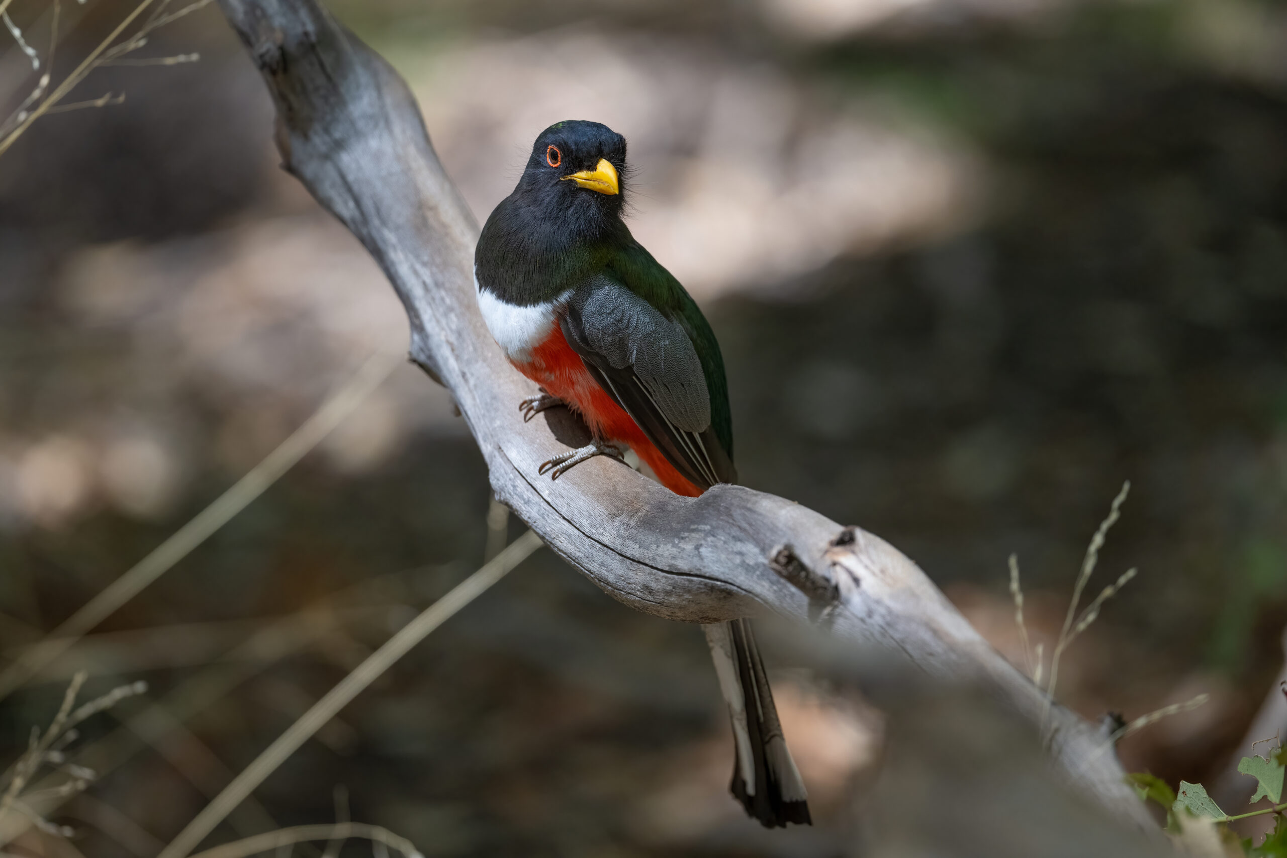 The elegant trogon is a near passerine bird in the trogon family. Along with the eared quetzal, it is the most poleward-occurring species of trogon in the world, ranging from Guatemala in the south as far north as the upper Gila River in Arizona and New Mexico.- Wikipedia